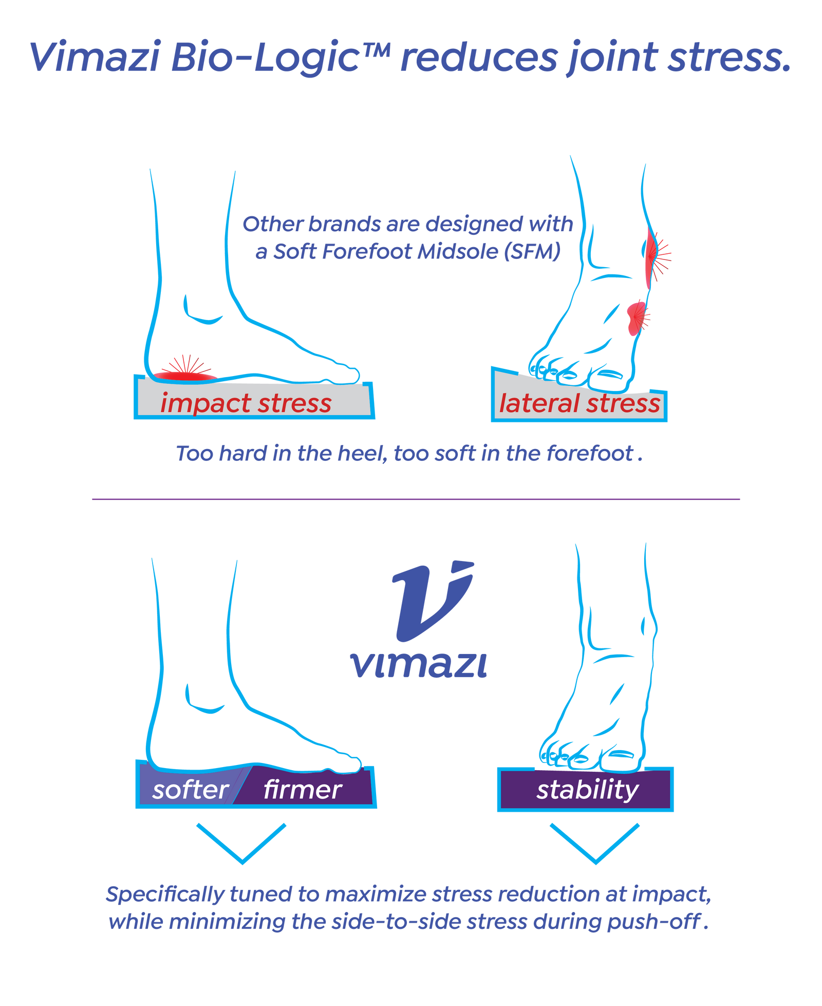 Yes. Vimazi's Bio-Logic design reduces joint stress while walking and running. We calculated the stresses on each joint, for walking, running, and over the range of paces a human can accomplish. We then engineered the curvature of the sole and the compression properties of the foams to create the most stress-reducing design. Vimazi is the first brand to use the science of joint mechanics to work with the natural motions of your body.